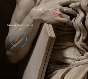 Viens no izcilākajiem piemēriem Mikelandželo meistarībai ir viņa precīzais attēlojums mazam, bieži aizmirstam muskulim extensor digiti minimi – tas atrodas priekšdelmā un aktivizējas tikai tad, kad tiek izstiepts mazais pirksts.