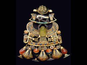 Senās Ēģiptes faraona Tutanhāmona kapā atrastais krūšu rotājums jeb pektorālis ir viens no nozīmīgākajiem artefaktiem, kas savieno seno pasauli ar kosmiskām parādībām. Rotas centrā ir skarabeja figūra, izgatavota no retas dzeltenzaļas stikla masas, ko mūsdienās pazīstam kā Ļībijas tuksneša stiklu.
