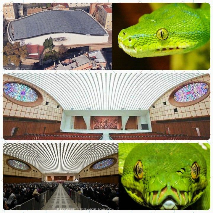 - Pāvesta auditorijas zāle (Paul VI Hall) – skatoties no augšas, ēka atgādina čūskas galvu, kur logi veido acis, bet centrālā skatuve – čūskas muti. Teorētiķi šo salīdzina ar Bībeles “vecās čūskas” simboliku.